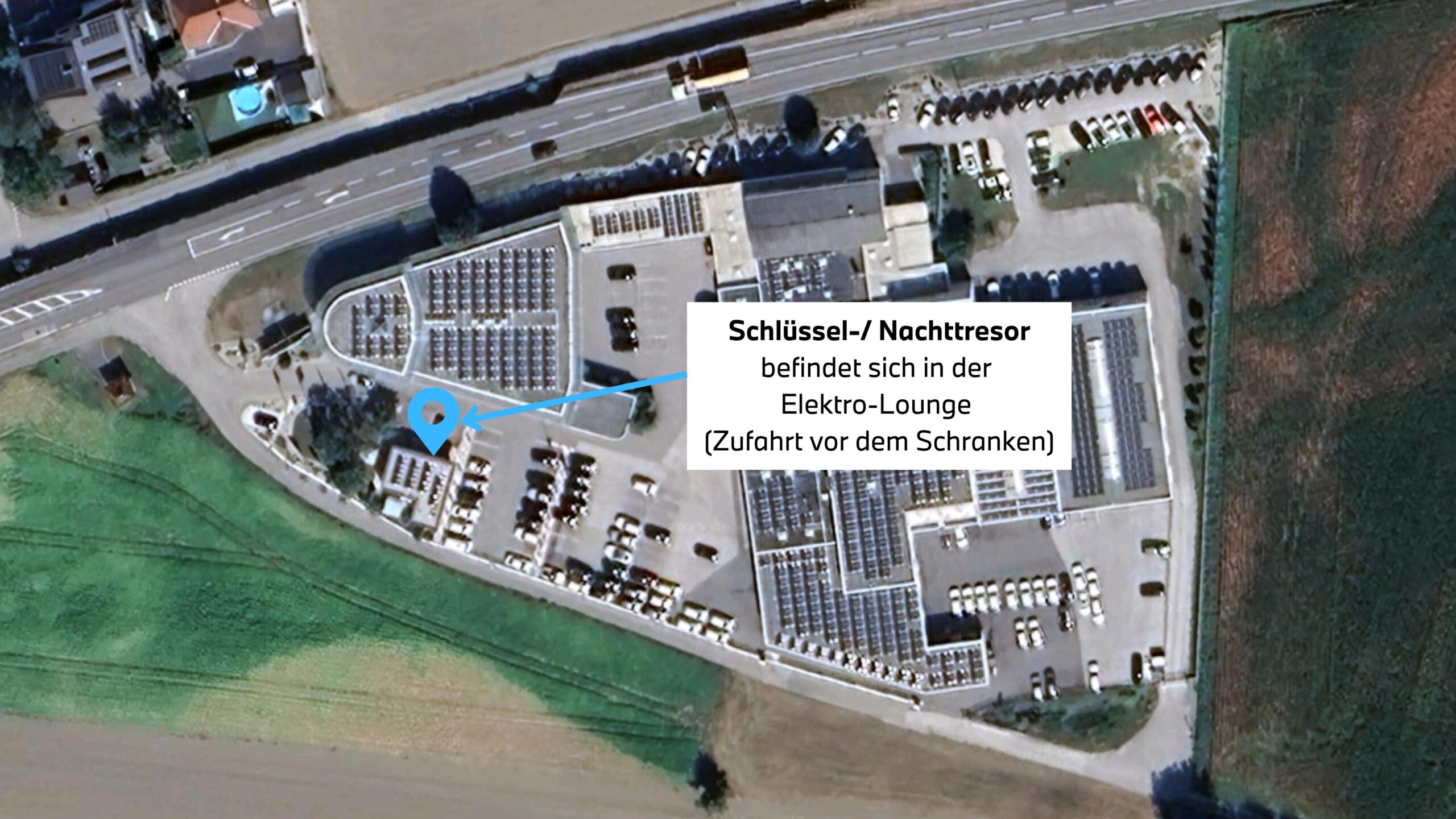 Unser Schlüsseltresor befindet sich in unserer Elektro-Lounge, direkt bei der Zufahrt und noch vor dem Schranken.